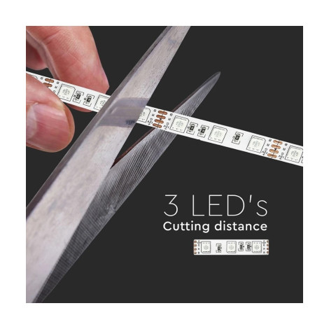 Strippen kan afkortes for hver 5 cm, så du altid kan tilpasse længden til dit projekt – uanset om det er accentbelysning under møbler, indirekte belysning på vægge eller farverige effekter i hjemmebiografen.